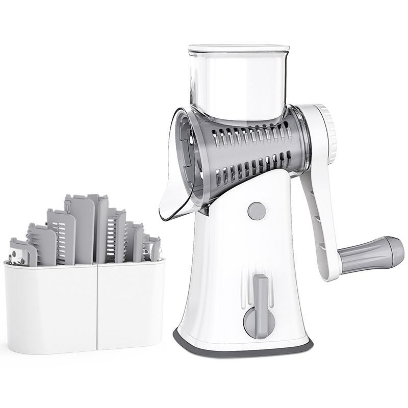 Versatile Design: This rotary cheese grater features a 5-in-1 design with five interchangeable stainless steel blades for slicing, shredding, and grating various foods.